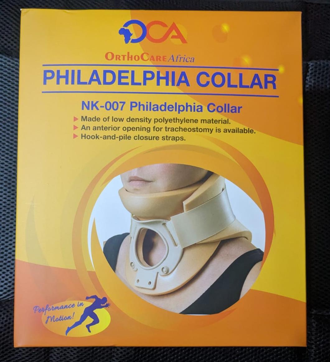A Philadelphia cervical collar is a type of neck brace used to immobilize the neck and support the cervical spine in cases of injury, surgery, or other conditions requiring stabilization.